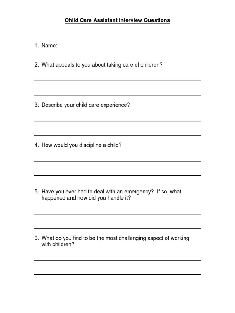 This question is another way for the interview to inquire about how you stand out from other candidates. Child Care Center Director related Frequently Asked Questions by expert members with professional career as Child Care Center Director. Childcare Interview Questions Name_____ Date of Interview_____ 1.